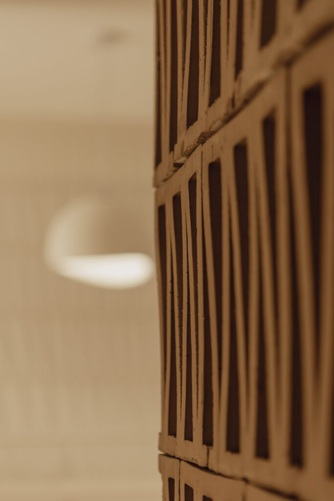 Il legno avvolge lo spazio con il suo calore naturale, conferendo un senso di autenticità e accoglienza immediata. A fare da contrappunto, i mattoni Celosia, disegnati da Patricia Urquiola, introducono un elemento di design sofisticato. Questi mattoni in terracotta estrusa, disposti a creare un pattern geometrico e dinamico, non si limitano a decorare: funzionano come veri e propri diaframmi visivi. Il loro gioco di “vedo-non vedo” modula la luce, definisce le diverse aree senza mai sacrificarne la continuità spaziale ed evoca, nelle sue geometrie, un richiamo discreto ai sistemi di numerazione antichi.
