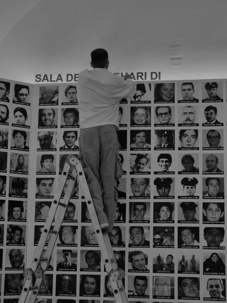 Le pareti, uniformi e compatte, definiscono un perimetro netto. Le superfici verticali sono rivestite da un muro continuo di fotografie che, in termini spaziali, funzionano come una seconda “pelle architettonica”: un rivestimento ritmico, modulato da centinaia di riquadri visivi che trasformano l’involucro della sala in un unico grande piano iconografico. La scelta di un rivestimento continuo elimina la percezione di frammentazione e crea un senso di avvolgimento, come se lo spazio si chiudesse a proteggere il suo centro.